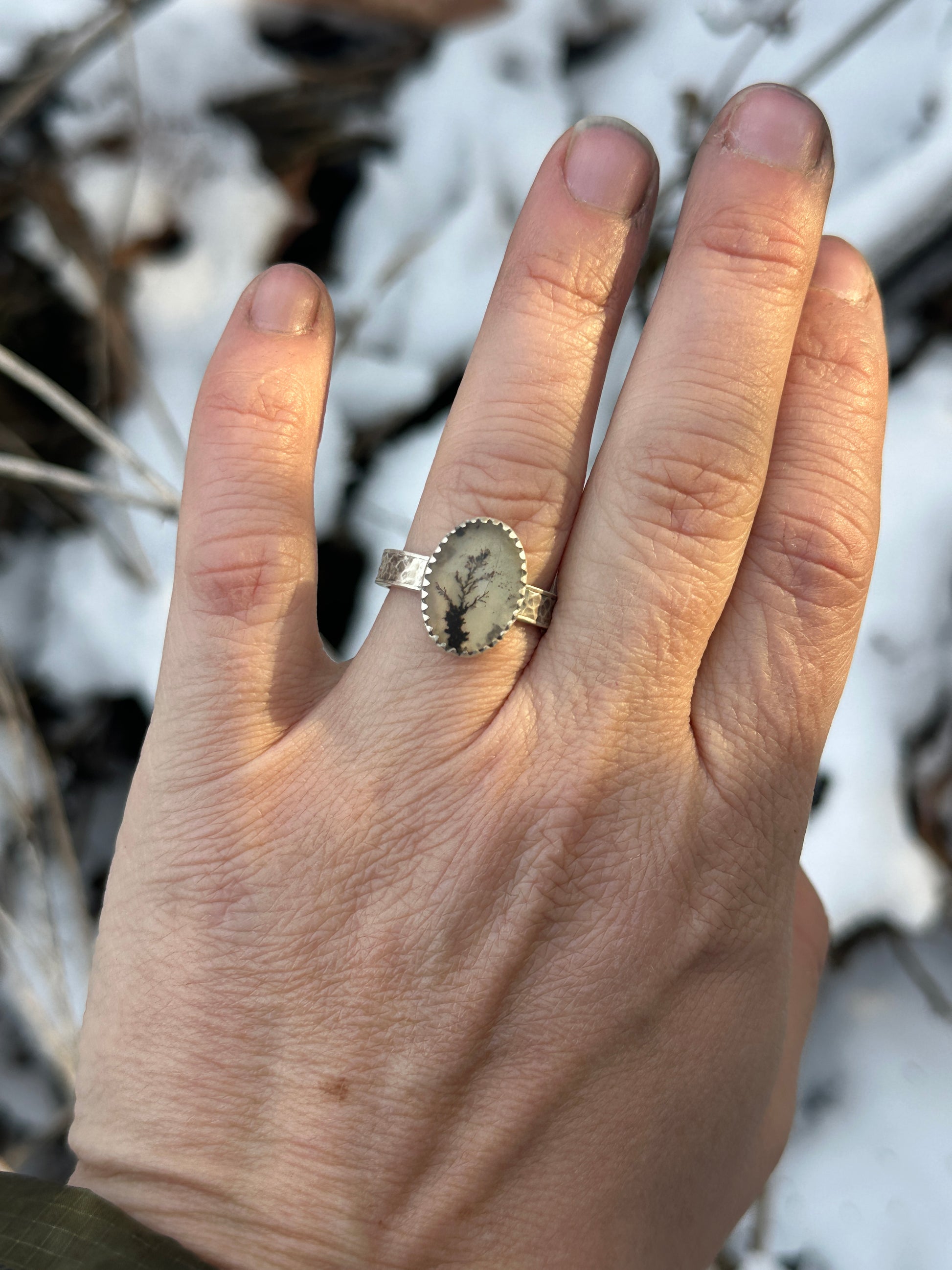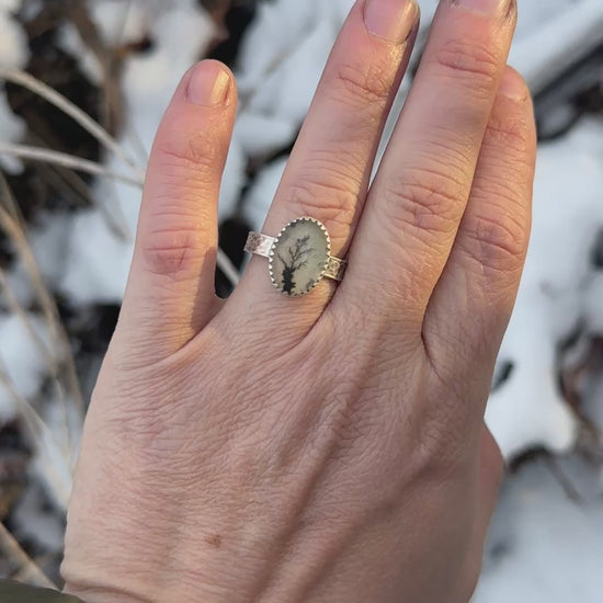 Oval dendritic Agate tree ring set in recycled sterling silver on wide hammered band. Ring is a size 7.5