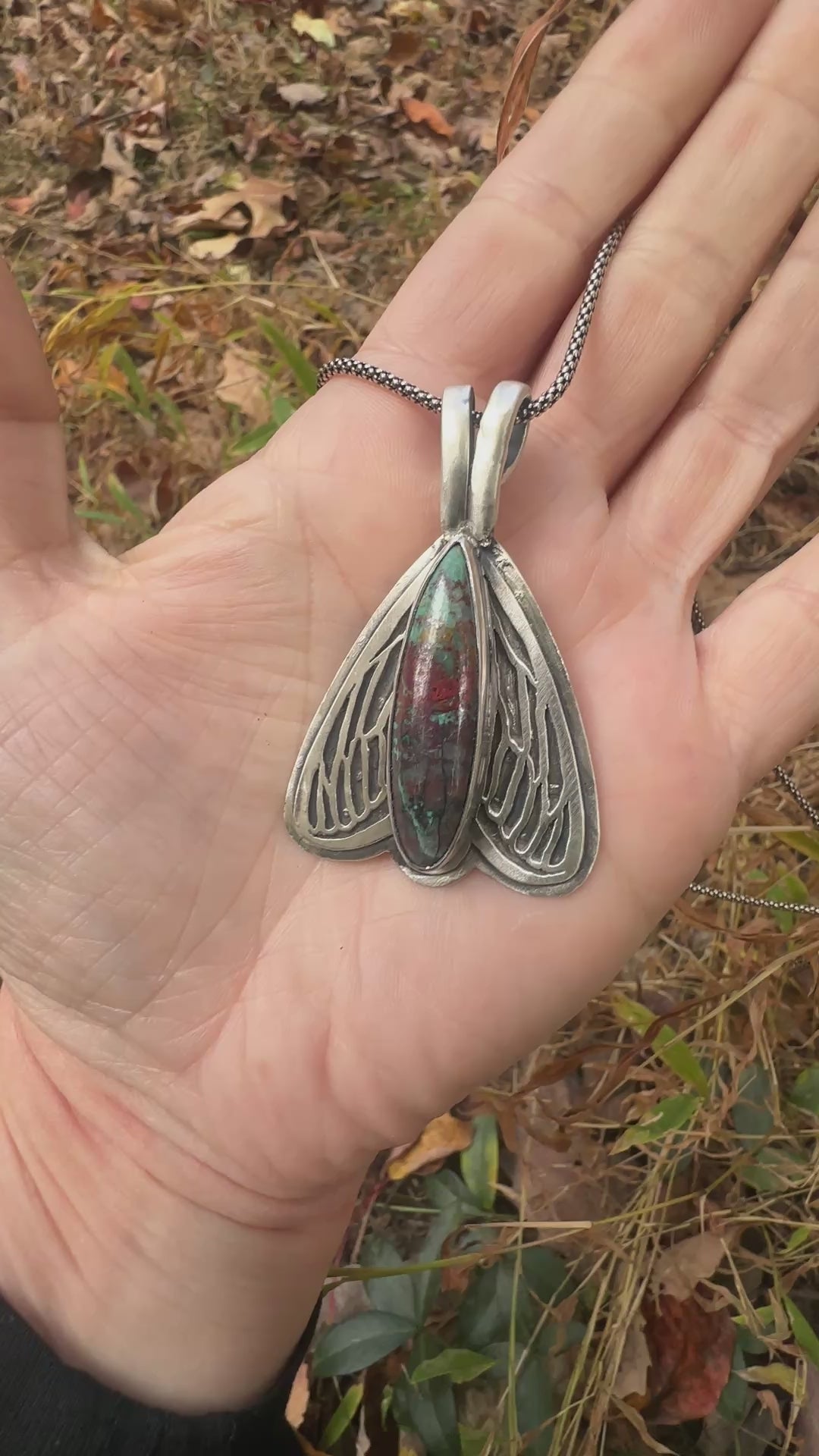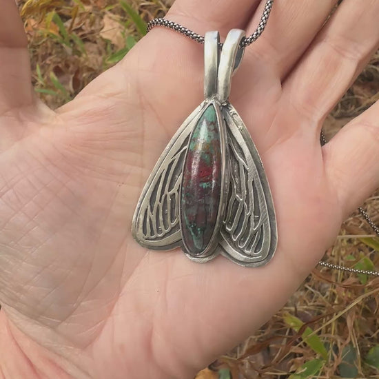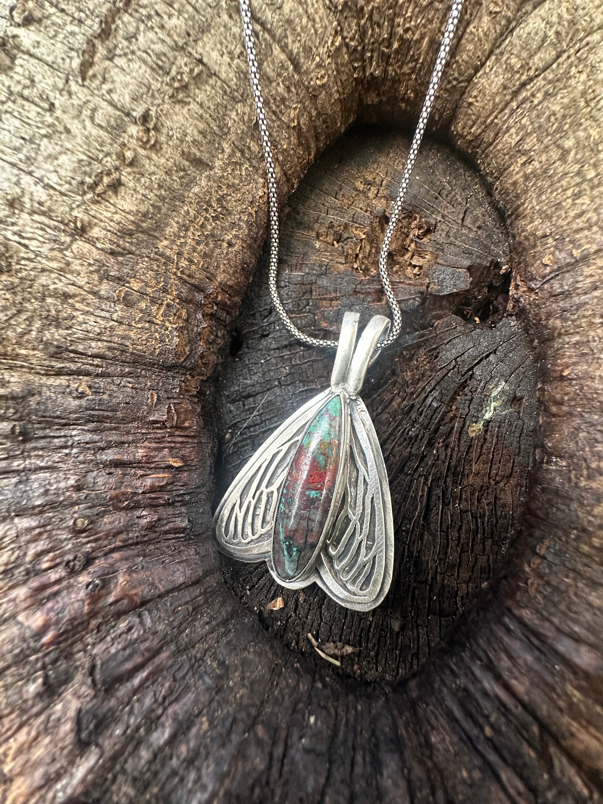 This necklace features a colorful Turquoise on an 18' long sterling chain. The wing details are completely hand sawn, pierced (drilled) by hand then each tiny hole meticulously cut out into shape with a tiny jewelers saw blade. Entirely made using certified recycled sterling silver and comes in recycled and compostable gift packaging.